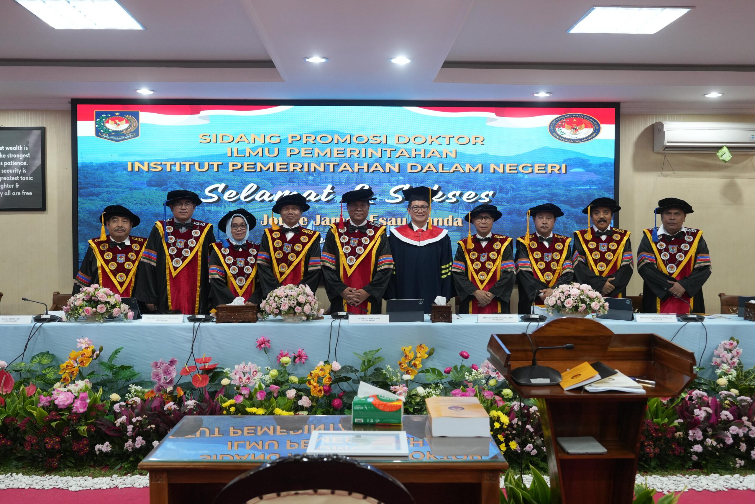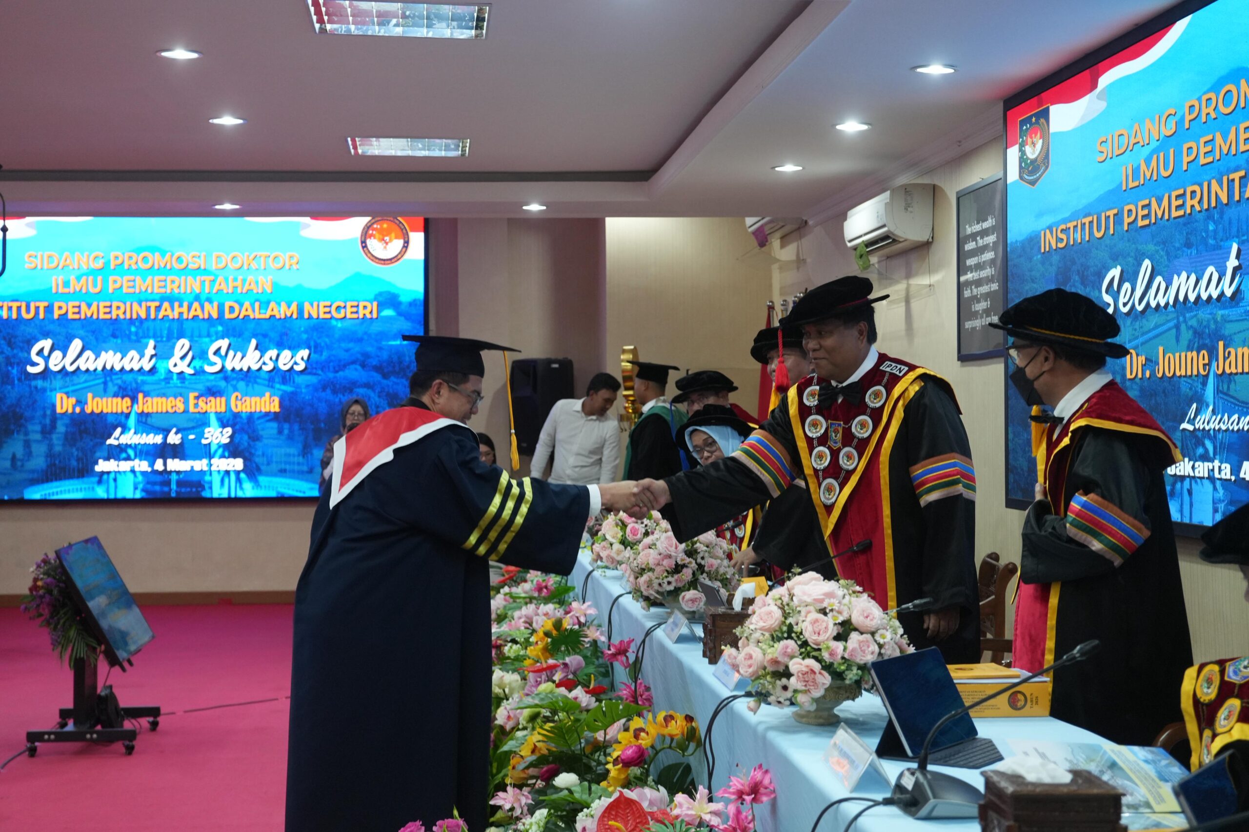 JAKARTA — Setelah mempresentasikan disertasi berjudul “Implementasi Pengembangan Kebijakan Pariwisata Kawasan Metropolitan Bimindo (Bitung–Minahasa–Manado) di Provinsi Sulawesi Utara” dalam forum akademik sidang terbuka Program Pascasarjana di Institut Pemerintahan Dalam Negeri, Rabu (4/3/2026), Bupati Joune James Esau Ganda berhasil meraih gelar doktor.
